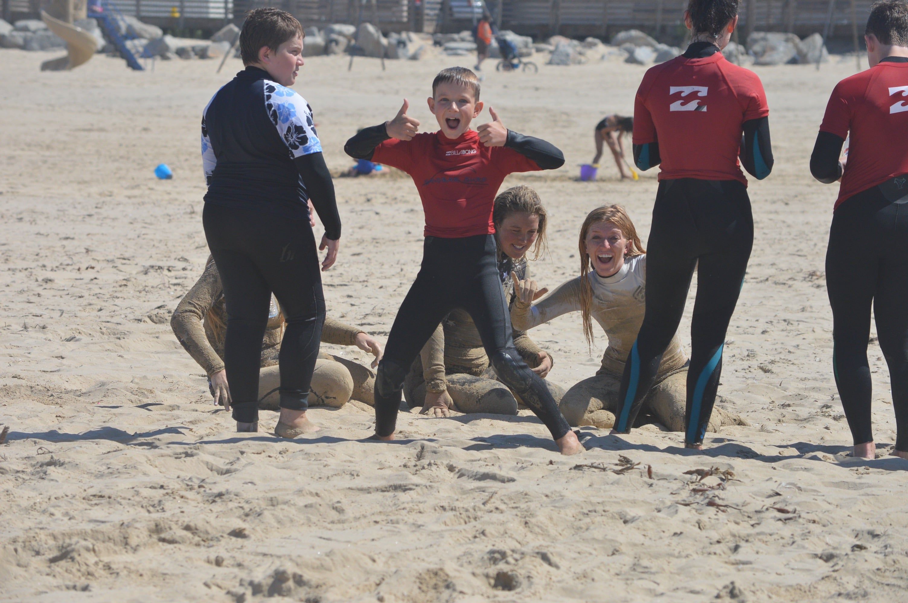 Our Private Group Surf Lessons, $60 Open Group Surf Lessons, and “Learn to Surf” group all – day surf camps are all geared for ages 7 and up, perfect if this is your first time in the water, putting on a wetsuit, or even touching a surfboard. We go through all of this with you, using language that YOU understand and helping you learn the stuff you don’t! – Wetsuits, safety Surf Leashes, Soft-top Surfboards, and the Ocean are provided!
